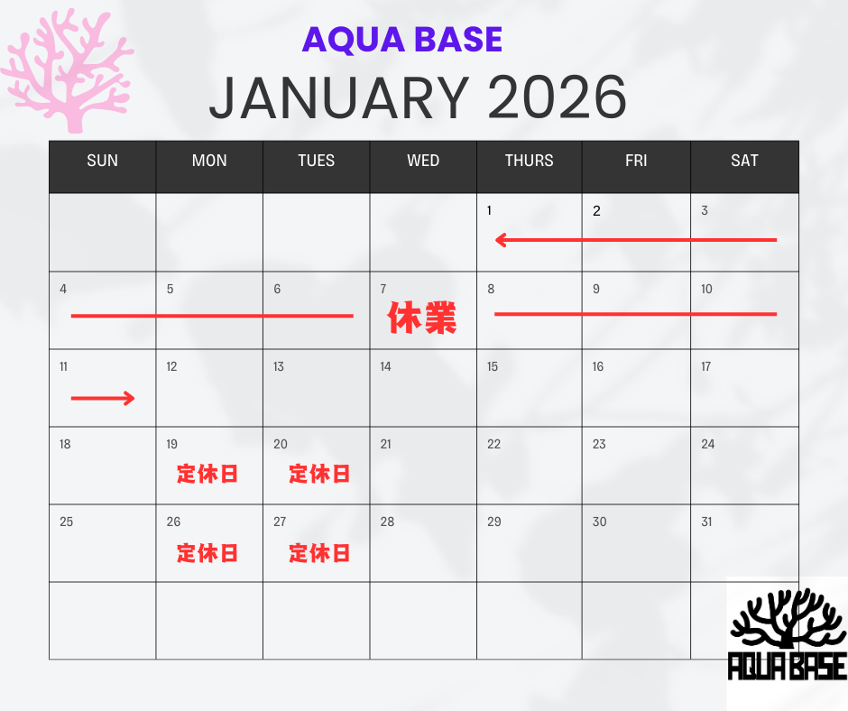 いつもAQUA BASEをご利用いただきありがとうございます。 2026年1月は、12日より通常営業となります。皆様にはご迷惑をおかけしますが何卒よろしくお願いいたします。 また休業期間中のオンラインショップからのご注文 […]